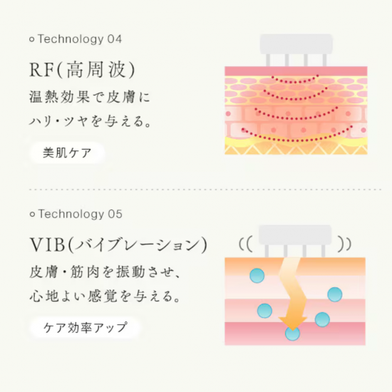 さらに、じんわり頭皮を温める「RF(高周波)」や、髪の水分を内側に浸透させる「テラヘルツ」、乾燥した髪の静電気を抑える「プラズマイオン」、心地よい振動の「VIB(バイブレーション)」とともに、深層※からも表面からも生き生きした美しい髪へと導けます。