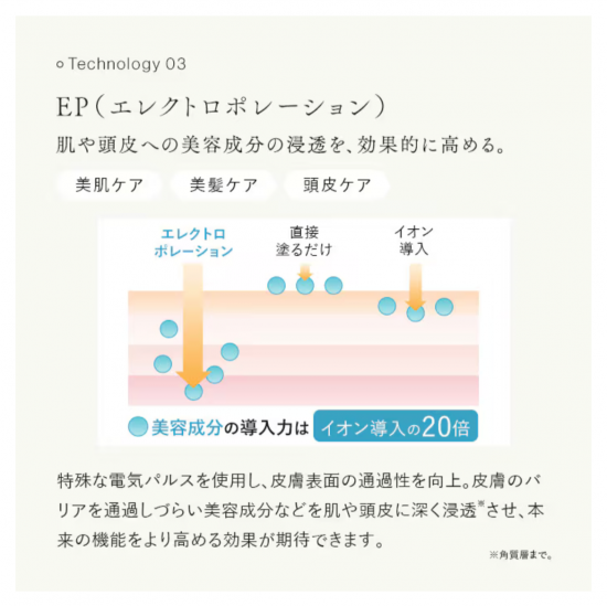 また、特殊な電気パルス「EP(エレクトロポレーション)」による刺激が、皮膚をキズつけず、